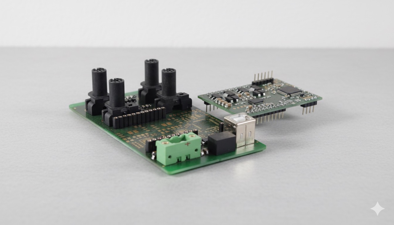 Das IO-Link Master Modul kann auf eine existierende Platine aufgesteckt werden. Für Entwicklungszwecke ist ein Basisboard mit verschiedenen Schnittstellen verfügbar.