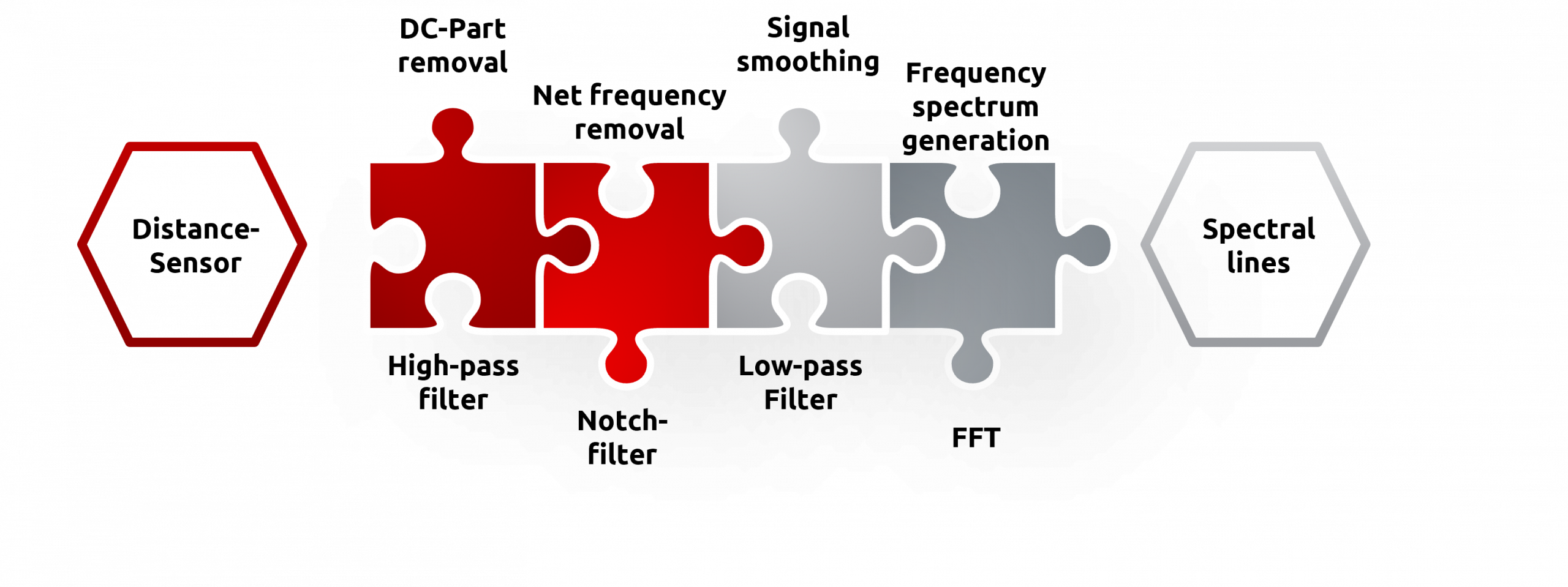 - Rauschen eliminieren: DC-Anteil werden per Hochpass-Filter und die und Netzfrequenz über einen Notch-Filter herausgefiltert. Ein Tiefpassfilter glättet das verbleibende Signal.